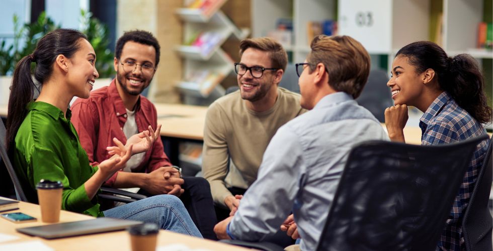 A group of B2B professionals from different teams sitting together in a collaborative meeting, engaged in discussion and relationship-building, illustrating how customer intelligence helps organizations share relationship context, improve coordination, and identify growth opportunities across accounts.