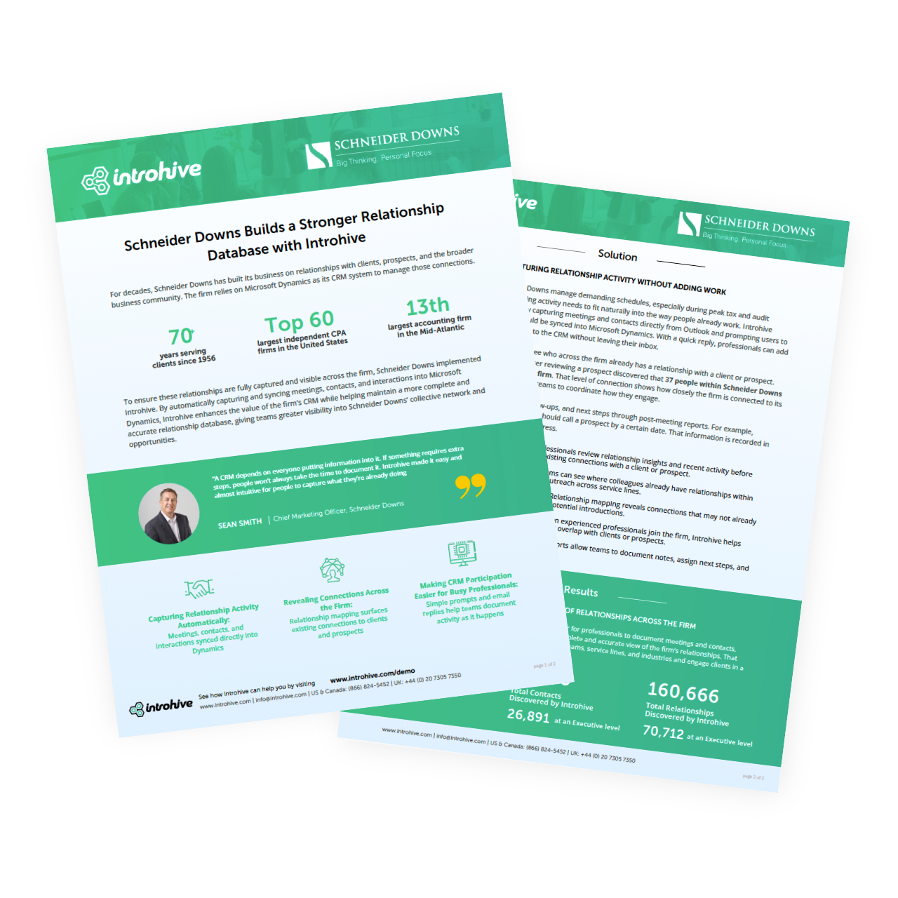Schneider Downs, a relationship-driven firm, partnered with Introhive to strengthen visibility across its network by enhancing Microsoft Dynamics as a single source of truth. By automatically capturing and syncing meetings, contacts, and interactions, Introhive enriched their CRM data and provided teams with greater insight into relationships and opportunities across the firm.